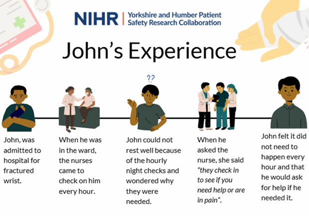 It is not always easy for patients to be able to know what parts of care are made to keep them safe. Many safety practices happen without people knowing – such as two members of staff checking medicines before they are given. From the view of patients, safety practices might look like conversations with a nurse in preparation for a procedure, being checked on every hour, or being restrained when unwell on a mental health ward to keep everyone safe.