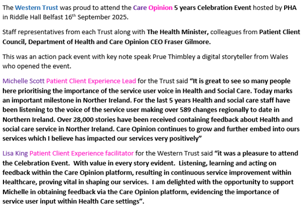 Care Opinion 5 year Celebration Event https://www.careopinion.org.uk/resources/blog-resources/0-images/332ac1252a77443c88c4764095c043c8.png Care Opinion 0114 281 6256 https://www.careopinion.org.uk /content/uk/logos/co-header-logo-2020-default.pngUpdate from Western Health and Social Care Trust